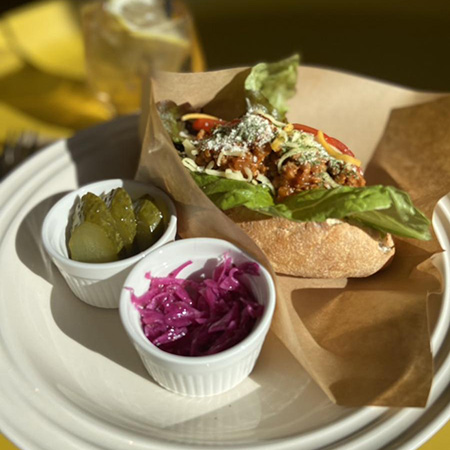 カフェでは地元のパン屋さん、精肉店さんとコラボして出来たMドッグをはじめ、カレーなどの気まぐれランチを提供しています。一部商品はテイクアウトも可能です。