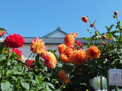 秋のイングリッシュガーデンに咲く色とりどりのダリア