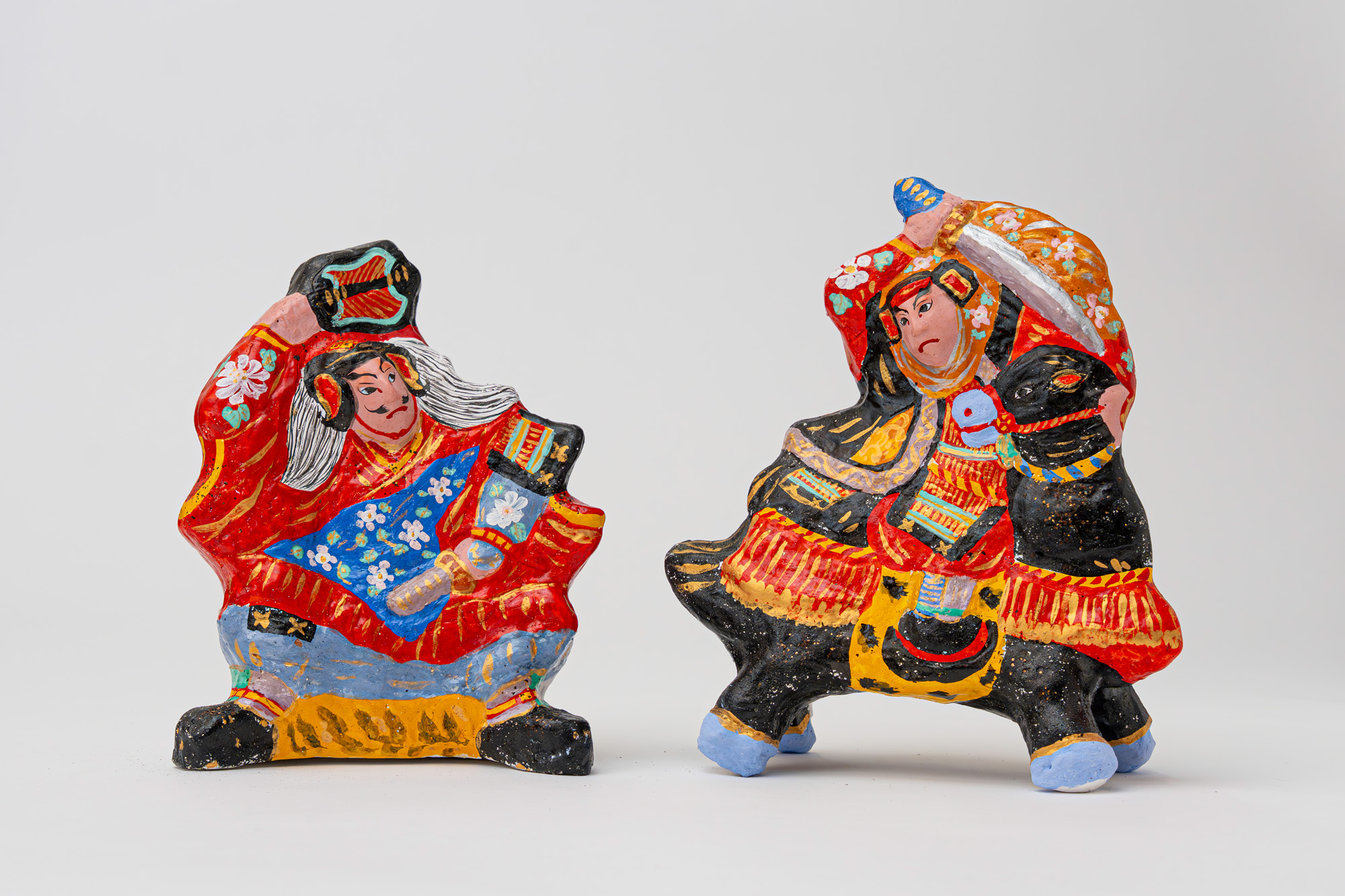 立ヶ花人形の産地である高丘地区には、良質の粘土が取れ、明治時代から屋根瓦焼が行われていました。明治30年頃、三河の瓦職人であった斉藤梅三郎が、中野の安源寺で瓦の製造をしていた西原己之作に、冬季間の副業として土人形制作を教えたのが、立ヶ花人形の始まりです。斉藤梅三郎は、歌舞伎に造詣深く、余技として土人形作者のために数々の歌舞伎人形の型を提供していました。西原家の人形は、こうした経緯から、歌舞伎ものや歴史上の人物ものが多く、現在約50種類余が制作されております。立ヶ花人形は、比較的大型のものが多く、色彩の鮮やかなのが特徴です。